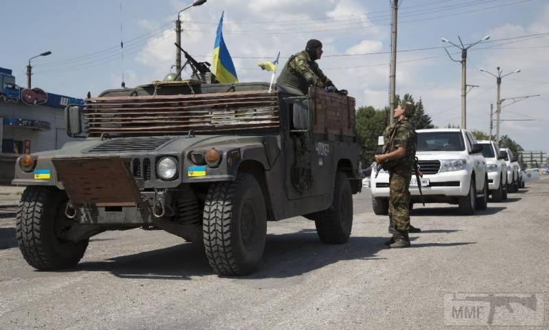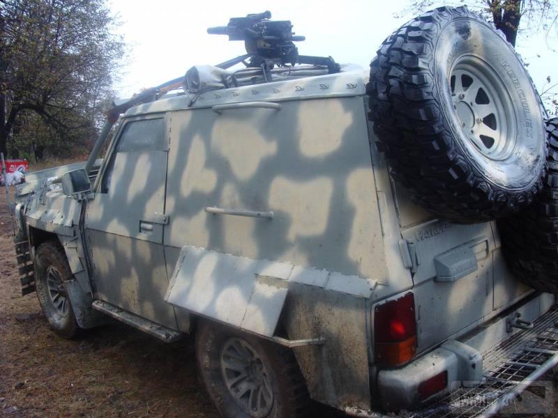 Просто "чпокер". База Хаммера с интересной уголковой броней на лобовом стекле. Идея изящна - увеличить вероятность рикошета пули и толщины стального листа, а также дать обзор водителю. Аналогичные приемы бронирования были замечена на бронетехнике в Сирии. Очевидно, машина работала в качестве конвойной для ОБСЕ.