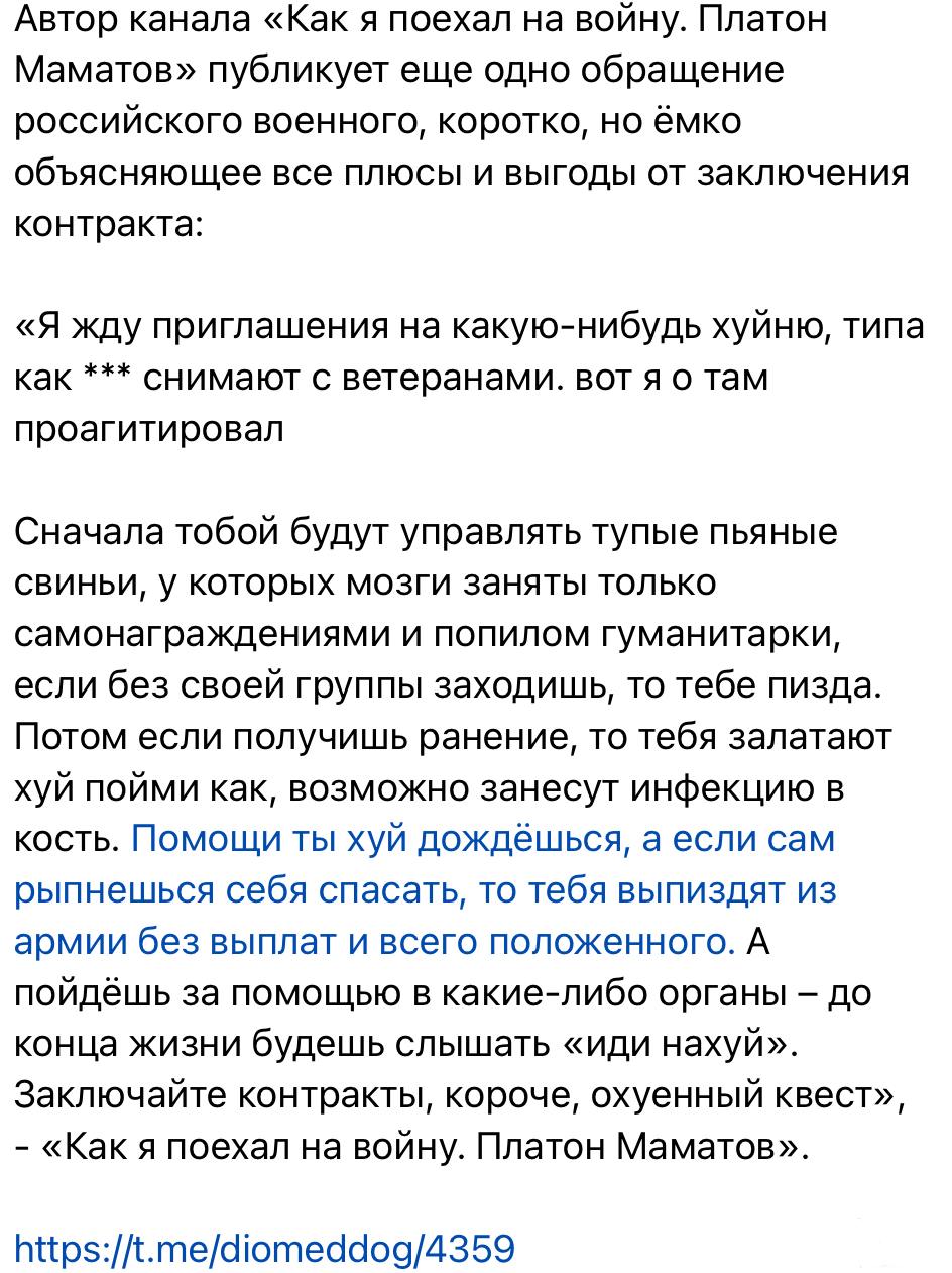 «Автор канала «ДШРГ Русич» предупреждает всех, кто думает о заключении контракта, что их отправят умирать в штурмы. Людей не хватает, хоть тушкой, хоть чучелком, хоть через «полки резерва», но единственная задача военного руководства — набрать достаточное количество «пехотного мяса», чтобы закрыть дыры на фронте:
