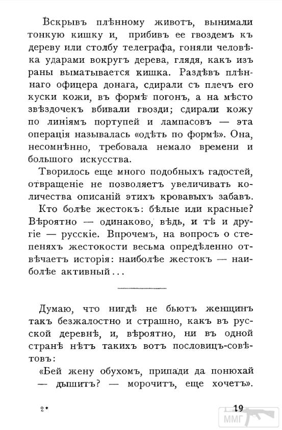 Вскрыв пленному живот, вынимали тонкую кишку и, прибив ее гвоздем к дереву или столбу телеграфа, гоняли человека ударами вокруг дерева, глядя, как из раны выматывается кишка. Раздев пленного офицера донага, сдирали с плеч его куски кожи, в форме погон, а на место звездочек вбивали гвозди; сдирали кожу по линиям портупей и лампасов - эта операция называлась «одеть по форме». Она, несомненно, требовала немало времени и большого искусства. Творилось еще много подобных гадостей, отвращение не позволяет увеличивать количество описаний этих кровавых забав. Кто более жесток: белые или красные? Вероятно - одинаково, ведь и те, и другие - русские. Впрочем, на вопрос о степенях жестокости весьма определенно отвечает история: наиболее жесток - наиболее активный...