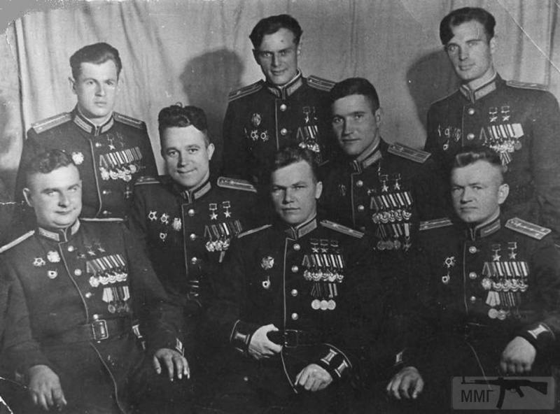 3-й ряд слева направо: Дважды Герой Советского Союза летчик-штурмовик Александр Николаевич Ефимов (222 боевых вылета, 1 сбитый самолет противника лично и 6 в группе, в ходе штурмовок разбил и сжег 9 эшелонов, 47 танков, 28 самолетов и много другой техники противника), Дважды Герой Советского Союза летчик-штурмовик Анатолий Константинович Недбайло (219 боевых вылетов, 5 сбитых самолётов противника лично, в ходе штурмовок уничтожил 17 самолетов, сжёг 30 автомашин, 16 танков и САУ, разбил десять железнодорожных вагонов, подавил 11 зенитных установок и 6 артиллерийских батарей), Дважды Герой Советского Союза летчик-штурмовик Василий Ильич Мыхлик (188 боевых вылетов, нанёс противнику большой урон в живой силе и технике).